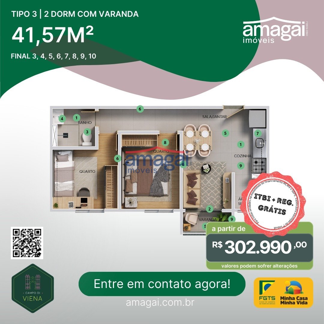 Apartamento de 41,57m², 2 Dormitórios, banheiro, sala de jantar, área de serviço e varanda.