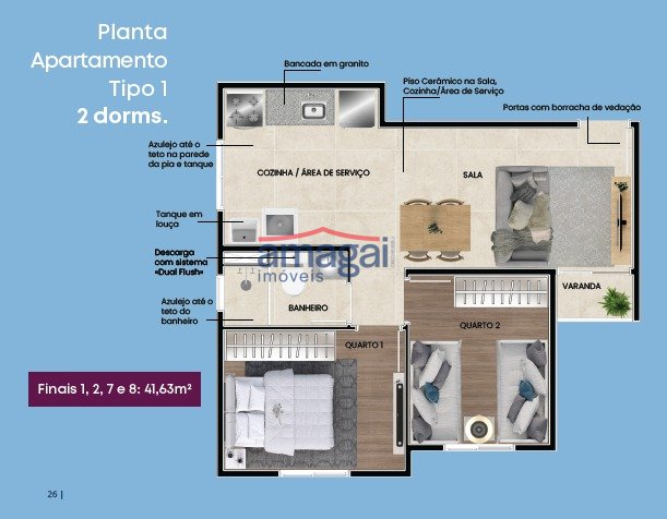 Apartamento, planta tipo 1 com 2 dorms. Finais 1, 2, 7 e 8: 41,63m2. A partir de R$265.000,00. - Bancada em granito; - Azulejo até o teto na parede da pia e tanque; - Tanque em... ver mais