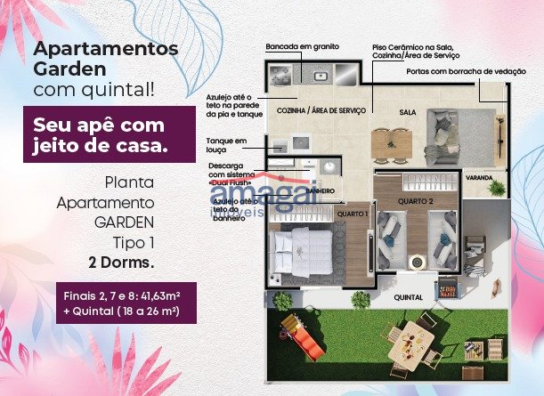 Apartamento, Planta GARDEN Tipo 1, 2 Dorms com quintal (18 à 26m²), Finais 2, 7 e 8: 41,63m2 + quintal (18 à 26m²). - Bancada em granito; - Azulejo até o teto na parede da pia e... ver mais