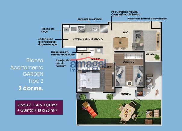 Apartamento, Planta GARDEN Tipo 2, 2 Dorms com quintal (18 à 26m²), Finais 4, 5 e 6: 41,87 + quintal (18 à 26m²). - Bancada em granito; - Azulejo até o teto na parede da pia e... ver mais