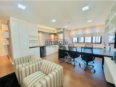 Sala comercial à venda, linda e com vista permanente para o Jardim Aquarius! Com 54m² bem distribuídos, é ampla, decorada e mobiliada. Possui papel de parede, carpete de madeira, armários embutidos, móveis, frigobar, TV e... ver mais